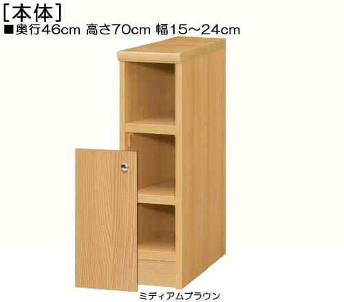 商品仕様 ■タイプ: 扉付 タフ棚板(棚板厚さ2.5cm)タイプ 片開き ■棚板耐荷重: 15Kg ■外寸: 奥行46cm×高さ70cm×幅15〜24cm (幅は1cm単位でオーダーできます) ■外寸(幅): 15cm 16cm 17cm 18cm 19cm 20cm 21cm 22cm 23cm 24cm ■扉高(実寸): 41.5cm ■棚板枚数 移動固定棚板:2 共通仕様 ■材質: プリント化粧繊維板 ■塗装: ウレタン樹脂塗装 ■素材: ホルムアルデヒドの発生を最小限に抑えた基材・芯材・プリント紙・接着剤(F☆