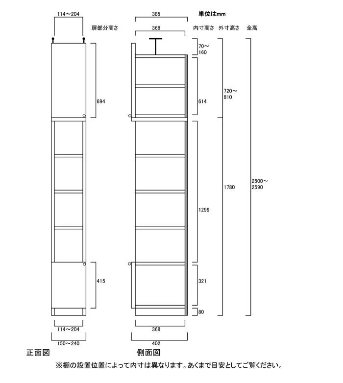 【オプション加工】1.5cm棚板ピッチ、幅木よけ、(配線用)裏板穴加工、タフ棚板穴加工 等 ※幅違い・高さ違い・奥行違いは全サイズ別一覧よりお選び下さい 扉付壁面すきま収納 タフ棚板(厚さ2.5cm) 奥行40cm×高さ250〜259cm×幅15〜24cm サイズオーダー リビング壁面収納 幅は1cm単位で指定 扉付壁面すきま収納 本体高さ178cm 突張棚高さ65cm 本体扉高さ41.5cm(下扉) 突張棚扉高さ69.4cm ご注意 オプション加工を選択されても価格が自動計算されません。